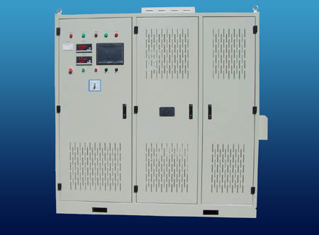 變頻電源部分內(nèi)主要布置有整流濾波器、中頻逆變器、濾波電抗器、風(fēng)冷散熱器、直流母線過壓吸收單元等組件。變頻電源柜體內(nèi)裝設(shè)4組性能一致,相互獨(dú)立運(yùn)行的整流濾波單元及逆變器單元,各逆變器單元輸出通過中頻輸出變壓器合成后輸出100KW功率。這樣每個(gè)逆變單元容量相對(duì)較小,而且當(dāng)一個(gè)單元發(fā)生故障時(shí),只需要退出該單元,不會(huì)影響整套設(shè)備的運(yùn)行。各逆變單元具有缺相、過流、過熱等保護(hù)功能。柜頂布置有散熱風(fēng)機(jī)。